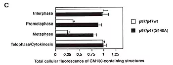 Image 3 and 4 The microinjection of p97/p47(S140A) preserves Golgi stacks (B) in mitotic late prometaphase cells whereas wtp97/p47 injected cells have typical mitotic Golgi clusters (A). Table (C)shows percentage of total Golgi membranes in each three categories (Uchiyama et al., 2003 JCB 161:1067-1079).
