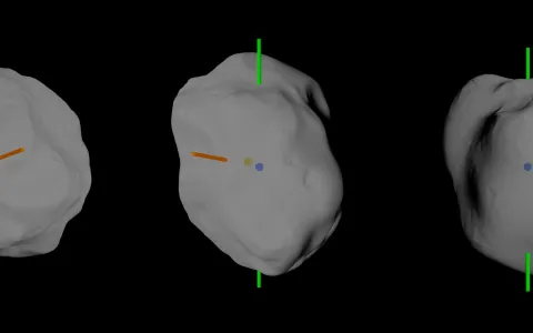 Figure 2. Asteroid (21) Lutetia’s photocenter (brown bullet) and center of mass (blue bullet) as projected in the direction of Gaia for three viewing geometries. The vertical axis (green bars) is in the direction of the z-axis of the equatorial reference frame (north is upwards) and the illumination by the Sun is in the direction of the red bar. The angle between Gaia and the Sun (the so-called phase angle) is, from the left to the right, 16.7, 24.2 and 20.9 degrees and the photocenter-barycenter distance is 7.42, 5.96 and 10.91 km, respectively. Reference and image credit: Tanga, P., Muinonen, K., Penttilä, A., et al., 2022, Astronomy & Astrophysics, in press.