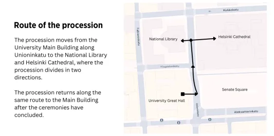 Entry: Through the doors on Aleksanterinkatu (Aleksanterinkatu 5) Cloakroom: Free of charge and supervised during the ceremony. Queues may form – please arrive in good time. Accessible entry: Through the inner courtyard at Yliopistonkatu 2. Access to the cloakroom via the inner courtyard, with lift access to the upper floor.