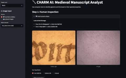To solve this, we built a custom Machine Learning pipeline using Python. The algorithm automatically isolates the target ink from the parchment background and calculates "spectral scores" based on physics-informed rules. For example, it measures how transparent an ink becomes under IR light, providing an objective metric to classify it as iron gall (transparent) or carbon-based (opaque).