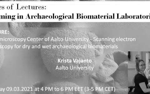 Tuesday 09.03.2021 at 4 PM to 6 PM EET (3-5 PM CET). Nanomicroscopy Center of Aalto University - Scanning electron microscopy for dry and wet archaeological biomaterials. Krista Vajanto, Aalto University.