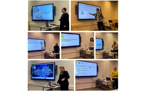 Doctoral researcher presented examples of integrating music into other subjects and to everyday practices in instructional settings. Examples were based on the material gathered mainly from Finnish theses. This material can be found at the website . This project Anni completed before starting as a doctoral researcher with the aim to investigate the willingness of university students to communicate in Swedish.