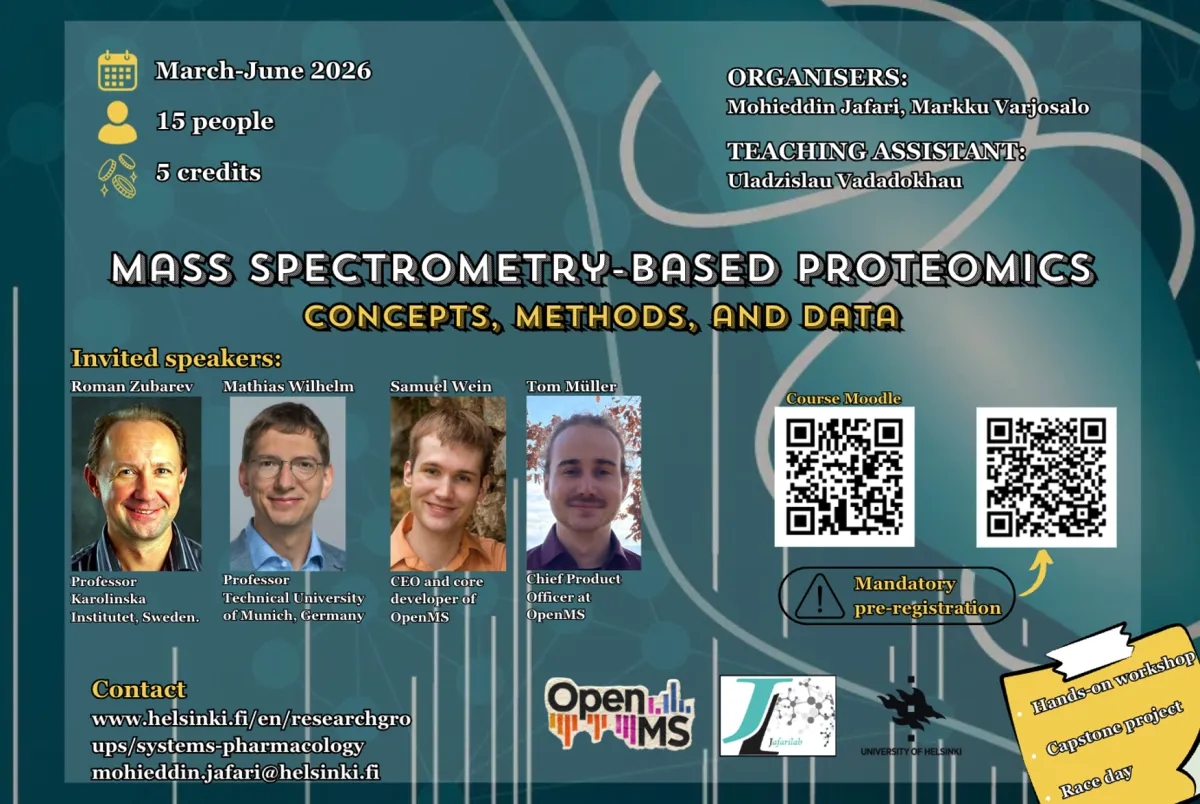 MS-PROT 2025/2026 is an engaging, hands-on course designed for students interested in the science of proteomics analysis and data interpretation. The course blends essential theory with practical applications, covering core principles of mass spectrometry (MS), protein and peptide identification and quantification, and advanced R-based data analysis. Students will gain real-world insights through interactive sessions, lab tours at the university’s proteomics core facilities, and direct exposure to cutting-edge MS platforms such as Orbitrap and MALDI-TOF. Led by Mohieddin Jafari and Markku Varjosalo, with contributions from leading international and internal experts, the course fosters critical thinking through pre-assignments, quizzes, and a collaborative capstone project based on real proteomics datasets.