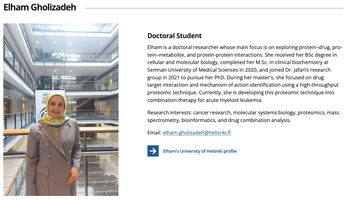 Mohieddin Jafari earned a Ph.D. in Applied Proteomics in 2013 from the Beheshti University of Medical Sciences under the supervision of Professor Mehdi Sadeghi. During his predoctoral studies (2011) at the Proteomics Resource at the Harvard School of Public Health (HSPH), he concentrated on protein fractionation in mass spectrometry-based proteome profiling under the supervision of Professor Alexander Ivanov. In 2015, he graduated from the Systems Biology Specialization Certificate program at the Icahn School of Medicine at Mount Sinai, where he focused on network biology applications employing high-throughput data mining and network analysis tools. In 2018, he began working as a senior researcher at the University of Helsinki, following 1+3 years as a postdoc and PI at the Pasteur Institute of Iran. He began his career at FIMM for one year before joining the ONCOSYS Research Program Unit, Dept. of Pharmacology, and Clinical Proteomics Core Facility, for more than three years. In 2020, he obtained his Docentship in Bioinformatics from Helsinki University. In 2023, Dr. Jafari launched his independent career as a principal investigator (PI) in the Systems Pharmacology Research Group, Department of Biochemistry and Developmental Biology.