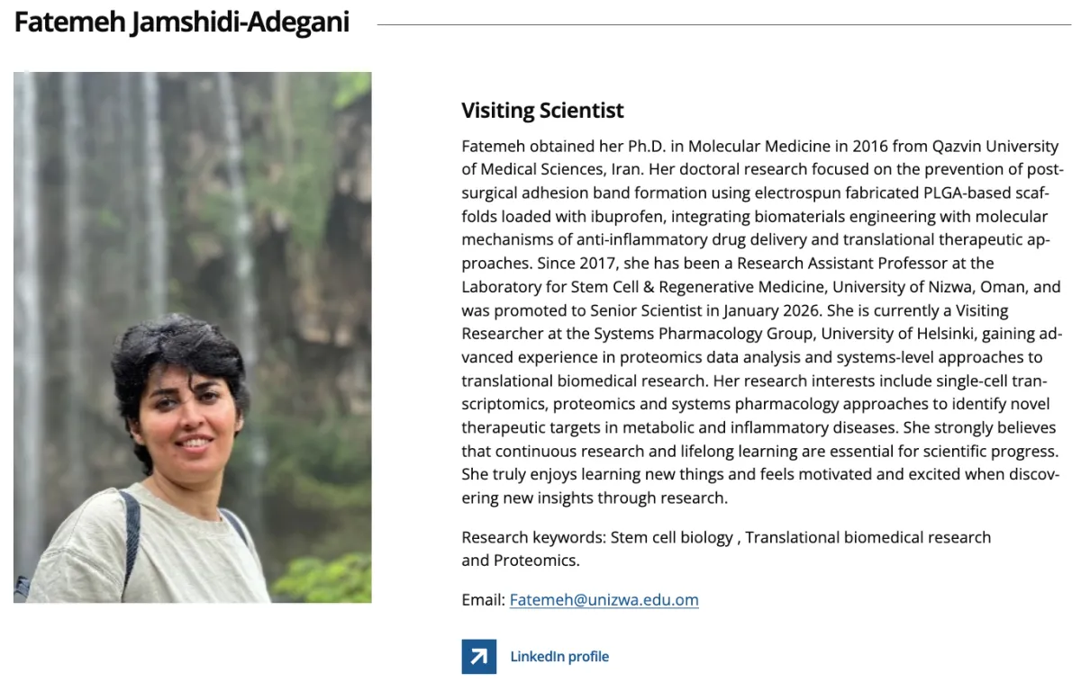 Fatemeh Jamshidi-Adegani, a visiting scientist from the University of Nizwa, Oman, with a background in molecular medicine and biomaterials, visited our lab to initiate collaboration in proteomics data analysis and systems pharmacology, with a focus on identifying therapeutic targets in metabolic and inflammatory diseases.