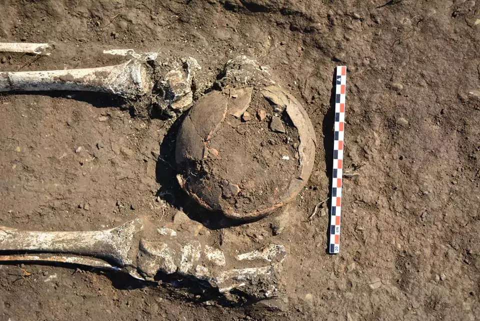 The primary burial contained the skeletal remains of an adult male individual lying supine with the knees initially raised and the arms stretched along the body. His head was oriented towards the west and nearby the right shoulder a small piece of ochre was found. The skeleton seems to be that of an unusually tall man. Later, around the II-III centuries AD the mound was once again used as a set for performing a burial, this time by Sarmatian populations. It was a double burial of an adult and a child and the grave goods consisted of a pot, an iron knife and five ovi-caprine astragali.
