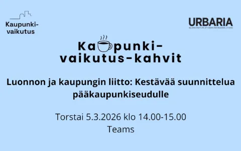Tule kuulemaan ja keskustelemaan tuoreista näkökulmista pääkaupunkiseudun kestävään kehittämiseen "Luonnon ja kaupungin liitto: Kestävää suunnittelua pääkaupunkiseudulle!" -webinaariin torstaina 5.3.2026 klo 14:00-15:00.