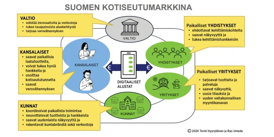 Kotiseutumarkkinoilla keskeisiä toimijoita ovat yritykset, yhteisöt, kansalaiset ja kunnat (ks. kuva). Kansalaiset ostavat verkon kautta paikallisten yritysten kärkituotteita/-palveluita, mutta pääsevät myös vaikuttamaan kohdistamalla osan ostosummasta paikallisiin kehittämishankkeisiin. Yritykset saavat kärkituotteilleen laajan digitaalisen näkyvyyden ja uuden markkinointikanavan. Yhdistykset osallistuvat kehittämishankkeiden ideointiin ja saavat sekä uusia resursseja että laajempaa näkyvyyttä toiminnalleen.