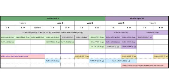 Alta löydöt taulukon, jossa on esimerkki suositellusta järjestyksestä missä arkeologian opinnot voidaan suorittaa. Taulukko toimii vain ohjenuorana suunnitelmallesi, sillä monet kurssit voidaan ottaa muussakin järjestyksessä. Kurssien saatavuus kannattaa aina tarkastaa