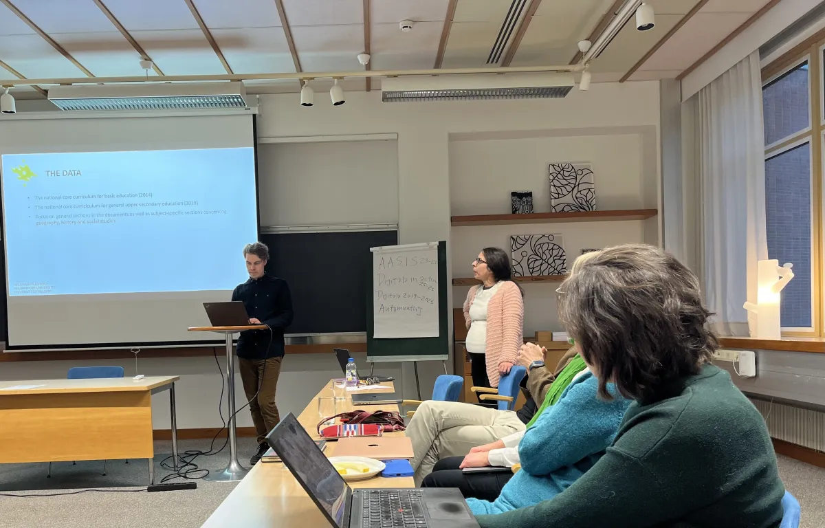 Amna Khawaja ja Mikko Puustinen sekä Janne Säntti esittelivät tutkimuksiaan humanistis-yhteiskuntatieteellisten aineiden tutkimusyhteisön seminaarissa 17.12.2025. Kuvat: Jukka Rantala