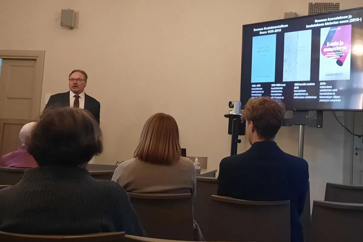 Mikko Puustinen esitelmöi aiheesta "Historian opetus ja arkistojen mahdollisuudet" ja Jukka Rantala osallistui paneelikeskusteluun aiheesta "Yksityisarkistot historianopetuksen osana" Yksityisten keskusarkistojen seminaarissa 24.11.2025. Kuvat: Mikko Mäntyniemi