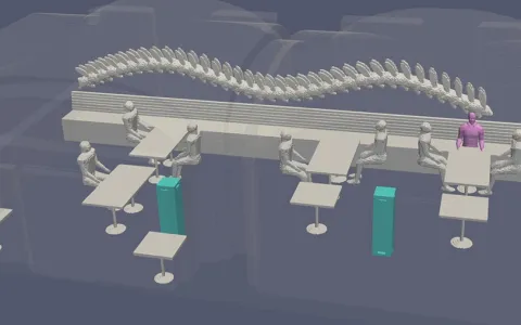 Esimerkki ravintola Ultiman 3D-mallista, jossa on mallinnettu ilmanpuhdistimien vaikutusta virusten leviämiseen tilanjakajien kanssa. Kuvitteellinen sairastunut henkilö (aerosolilähde) näkyy punaisena, ilmanpuhdistimet turkoosina ja tilanjakajat vihreinä. Vaalea, kaareva elementti henkilöiden yllä on ravintolatilassa oleva kattokoriste. Ravintolan seinät näkyvät läpikuultavina. Kuvasta voidaan nähdä käytetty asetelma, mutta kuvissa ei esitetä viruspitoisuuksia tai virusten liikkeitä tilassa.