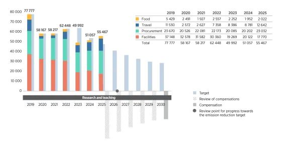 We have calculated our carbon footprint annually since 2019. Emissions are calculated according to the Greenhouse Gas Protocol (GHG). The table shows the carbon footprint divided into operational categories - facilities, procurement, travel and transport, and food, and the target state for reducing the carbon footprint by 2030. Due to changes in calculation methods, the 2025 figures are not fully comparable with those of previous years. A more comprehensive calculation method has been used for flight emissions, and purchased property maintenance services have been recategorised from Facilities to Procurement.