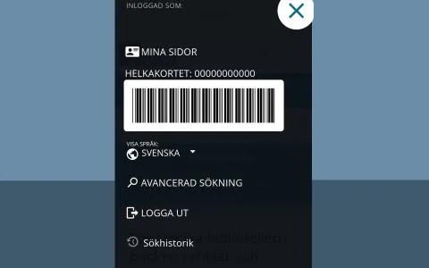 Klicka på de tre punkterna i övre högra hörnet av sidan för att visa streckkoden för ditt bibliotekskort.