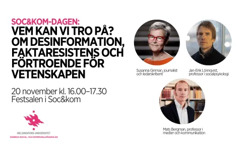 I en tid där rykten sprids snabbare än fakta, där AI suddar ut gränsen mellan fantasi och verklighet och där vetenskapliga rön ifrågasätts på sociala medier blir det allt svårare att veta vem eller vad man kan lita på. Under årets Soc&kom-dag diskuterar vi därför hur desinformation sprids, varför faktaresistens uppstår och hur förtroendet för vetenskap kan stärkas. Hur kan vi bygga tillit i en polariserad värld?
